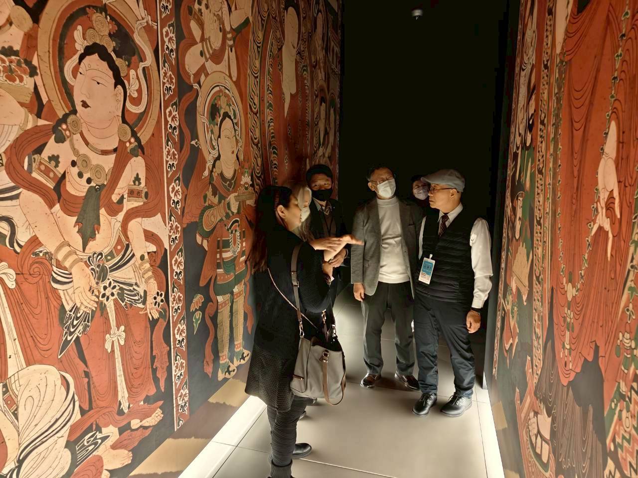 參訪團於20日抵達龍谷大學博物館,並由「古典籍・文化財數位保存研究中心」(Digital Archives Research Center ,DARC)中心長三谷真澄教授、副中心長曽我麻佐子准教授、道元徹心教授,以及博物館學藝員岩井俊平教授、岩田朋子教授親自接待,陳丹妮老師、Karen Lee TAWARAYAMA 老師協同擔任翻譯,參觀了佛教犍陀羅藝術,以及各項佛教文獻存檔。該研究中心與博物館深耕於高精度數位修復與虛擬建模技術,例如:曽我准教授與研究生的技術分享,利用Unity與影像處理技術,讓文物上的平面人物藝術在數位空間中舞動重生。其次,龍谷大學對於佛教壁畫的修復,並非追求技術的華麗表現,而是為了精準還原佛典背後的宇宙觀,其核心在於:必須理解佛學義理及當時代的藝術風格,才能在數位修復中準確補足流失的線條與神韻,這正是人文主導技術的最佳範例。